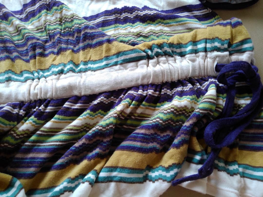 7分袖のウエストゴムとヒモで着やせ効果が期待できるボーダーのセミロング半袖シャツです。